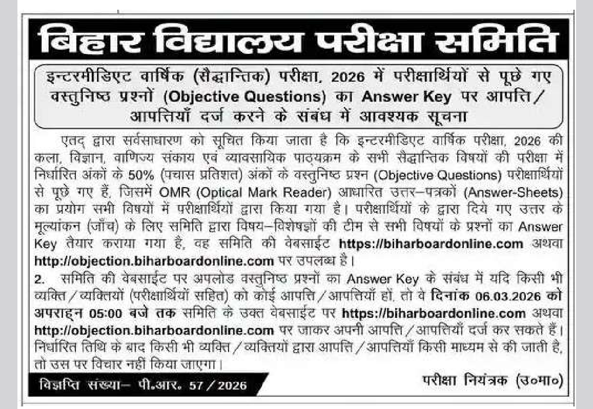 अगर आपने इंटर परीक्षा 2026 दी है, तो आंसर की जरूर डाउनलोड करें, जांच करें और जरूरत हो तो 06 मार्च 2026 से पहले आपत्ति दर्ज करें।