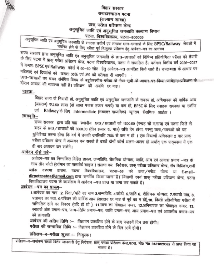 Bihar BPSC / Railway Free Coching 2026-Apply Date