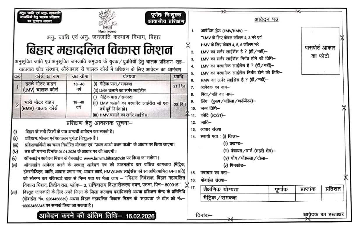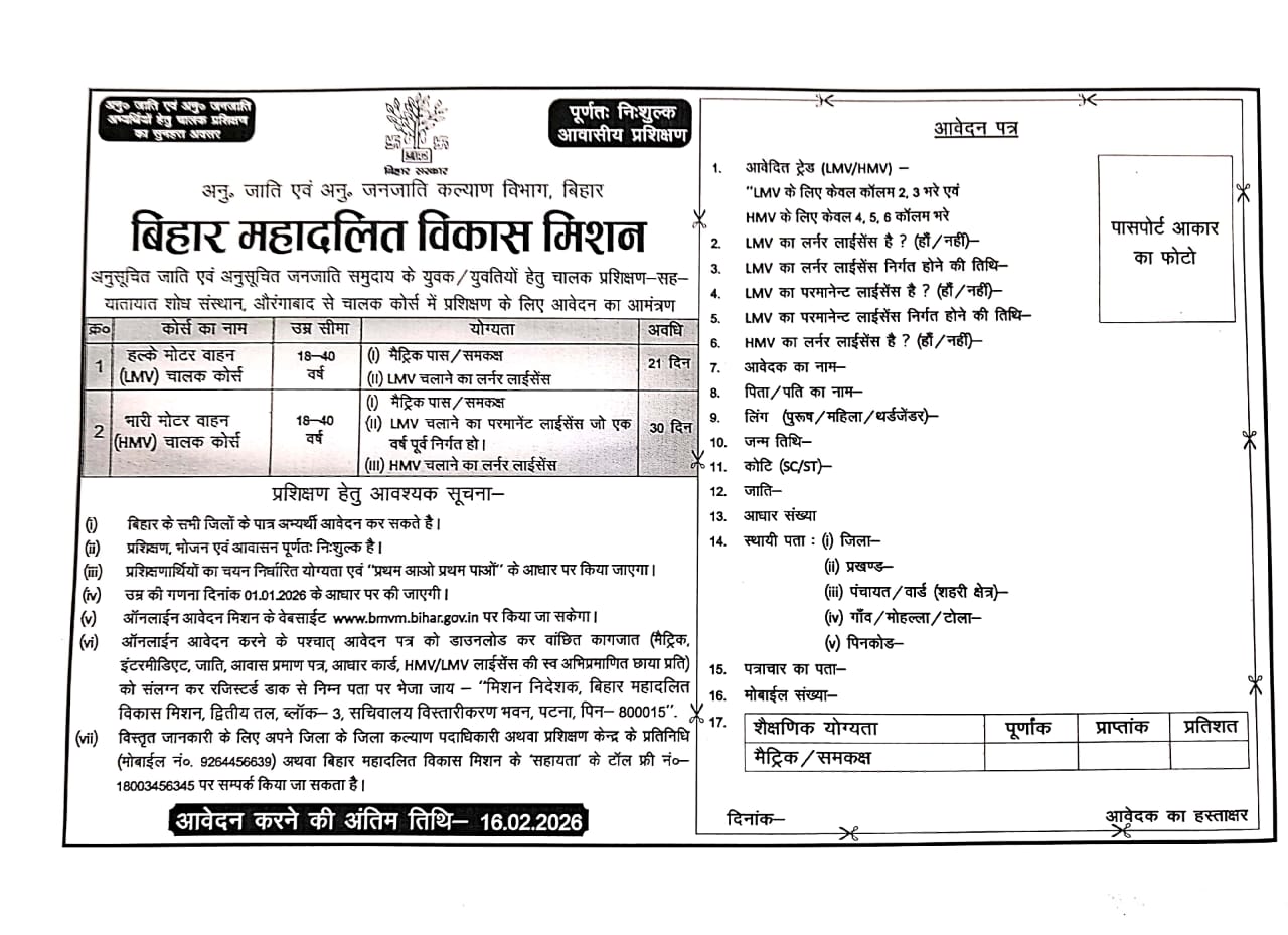दूसरी तरफ हम आप सभी को बता देना चाहते हैं तो आपके लिए बढ़िया मौका है , क्योंकि बिहार सरकार अनुसूचित जाति एवं अनुसूचित जनजाति कल्याण विभाग ( बिहार महादलित विकास मिशन पटना ) के अंतर्गत LMV/HMV Motar Vahan Course 2026 का फ्री में प्रशिक्षण दिया जा रहा है |