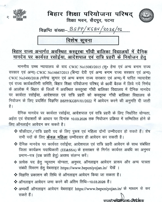 हमारे इस आर्टिकल में आप सभी उम्मीदवार का हार्दिक स्वागत और अभिनंदन है जिससे कि आप सभी को बता दें बिहार शिक्षा परियोजना परिषद के द्वारा कस्तूरबा गांधी बालिका विद्यालय में तीन अलग-अलग प्रकार के पद पर बहाली को लेकर आधिकारिक नोटिफिकेशन जारी कर दिया गया है बात करें तो उसमें रसोइया, आर्डरली, रात्रि प्रहरी पद है जो की 10 मार्च 2026 तक आप इसके लिए ऑनलाइन के माध्यम से आवेदन कर पाएंगे जिसकी पूरी जानकारी हम आपके पूरे विस्तार से बताएंगे-