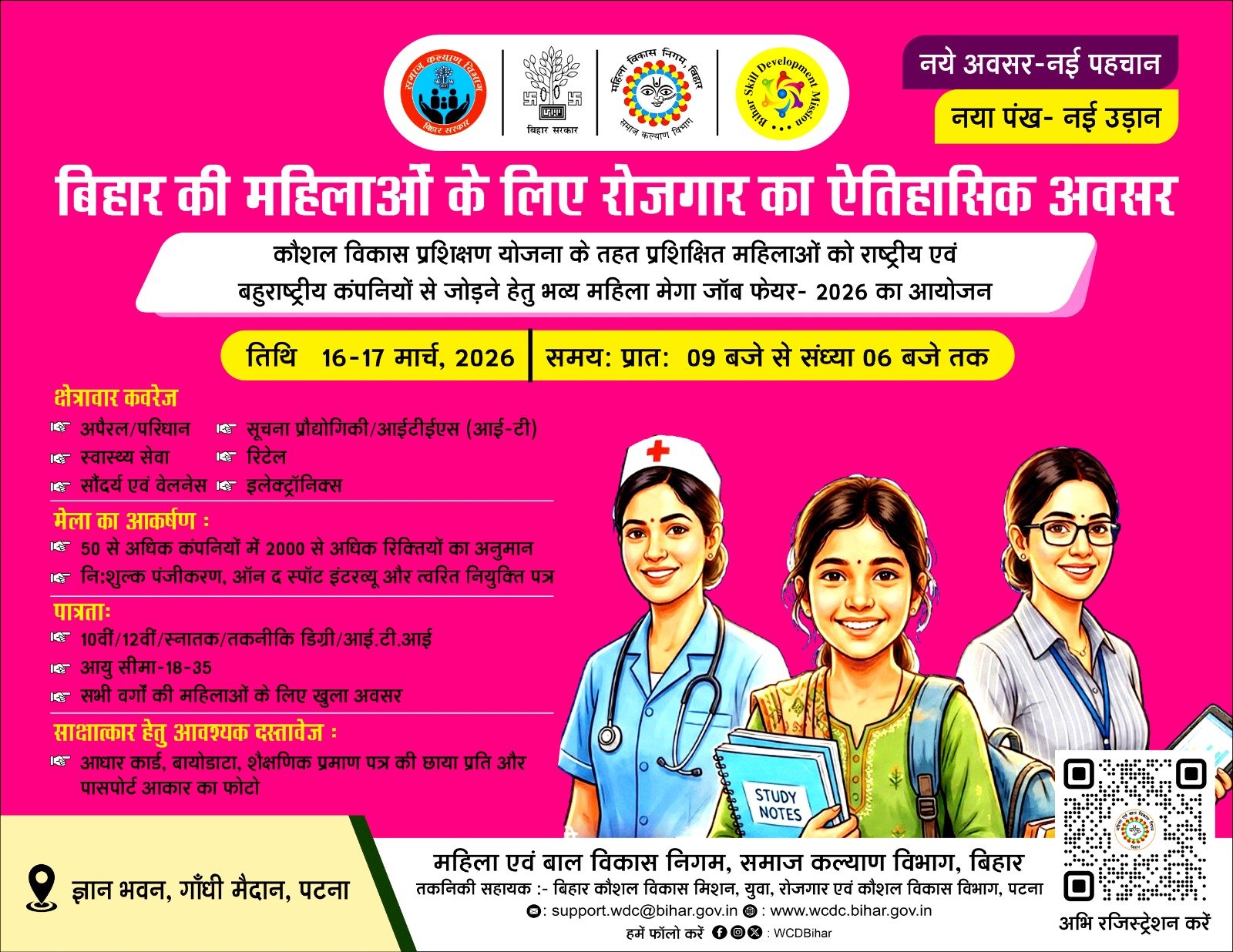 यदि आप भी नौकरी की तलाश कर रही हैं और आपके पास आवश्यक योग्यता है, तो आपको 16 और 17 मार्च 2026 को ज्ञान भवन, पटना में आयोजित इस जॉब फेयर में जरूर भाग लेना चाहिए।