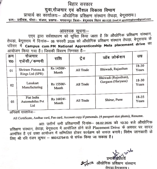 Bihar PM National Apprenticeship Mela 2026: नमस्ते स्वागत है हमारे इस आर्टिकल में तो आप सभी को बता दे अगर आप भी 10वीं 12वीं स्नातक पास कर चुके हैं और साथ ही साथ अपने आईटीआई भी कंप्लीट किया है तो आप सभी के लिए एक नई शानदार अपॉर्चुनिटी आ चुकी है बात करें तो बिहार सरकार के श्रम, रोजगार एवं कौशल विकास विभाग के अंतर्गत संचालित औद्योगिक प्रशिक्षण संस्थान (ITI) तेजपुरा, बेगूसराय में युवाओं के लिए एक बहुत बड़ी खुशखबरी सामने आई है। दिनांक 06 फरवरी 2026 को PM National Apprenticeship Mela 2026 के तहत Campus Cum Placement Drive का आयोजन किया जा रहा है।