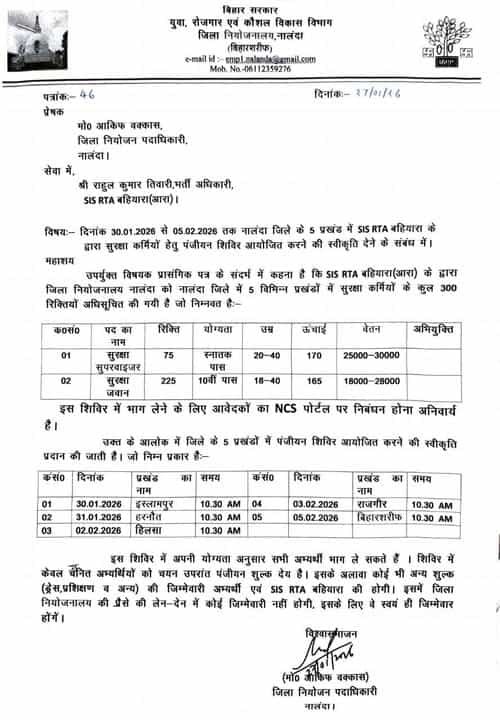 दूसरी तरफ हम आप सभी को बता देना चाहते हैं कि बिहार के नालंदा जिले के 5 प्रखंडों में रोजगार मेला 2026 का आयोजन किया जा रहा है, जिसके तहत सुरक्षा सुपरवाइजर और सुरक्षा जवान के कुल 300 पदों पर सीधी भर्ती की जाएगी।