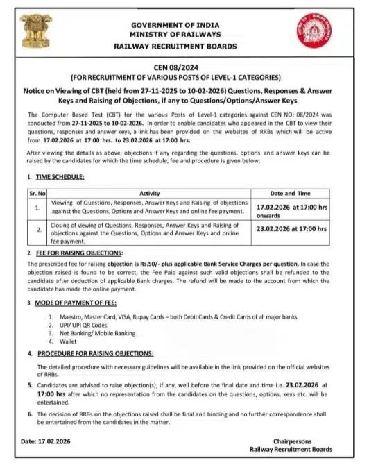 Railway Group D Answer Key 2026: नमस्कार दोस्तों कैसे हैं आप सभी तो आप सभी के लिए रेलवे भर्ती बोर्ड के द्वारा एक नई खुशखबरी अपडेट निकाल कर आ रही है जैसे कि आप सभी को बता दे अगर आपने 27 नवम्बर 2025 से 10 फरवरी 2026 के बीच आयोजित रेलवे आरआरबी ग्रुप डी भर्ती परीक्षा (CEN 08/2024) में भाग लिया है और अब अपने प्रदर्शन का मूल्यांकन करना चाहते हैं, तो आपके लिए बड़ी खबर है। 17 फरवरी 2026 शाम 5 बजे रेलवे भर्ती बोर्ड ने आधिकारिक रूप से Railway Group D Answer Key 2026 जारी कर दी है।