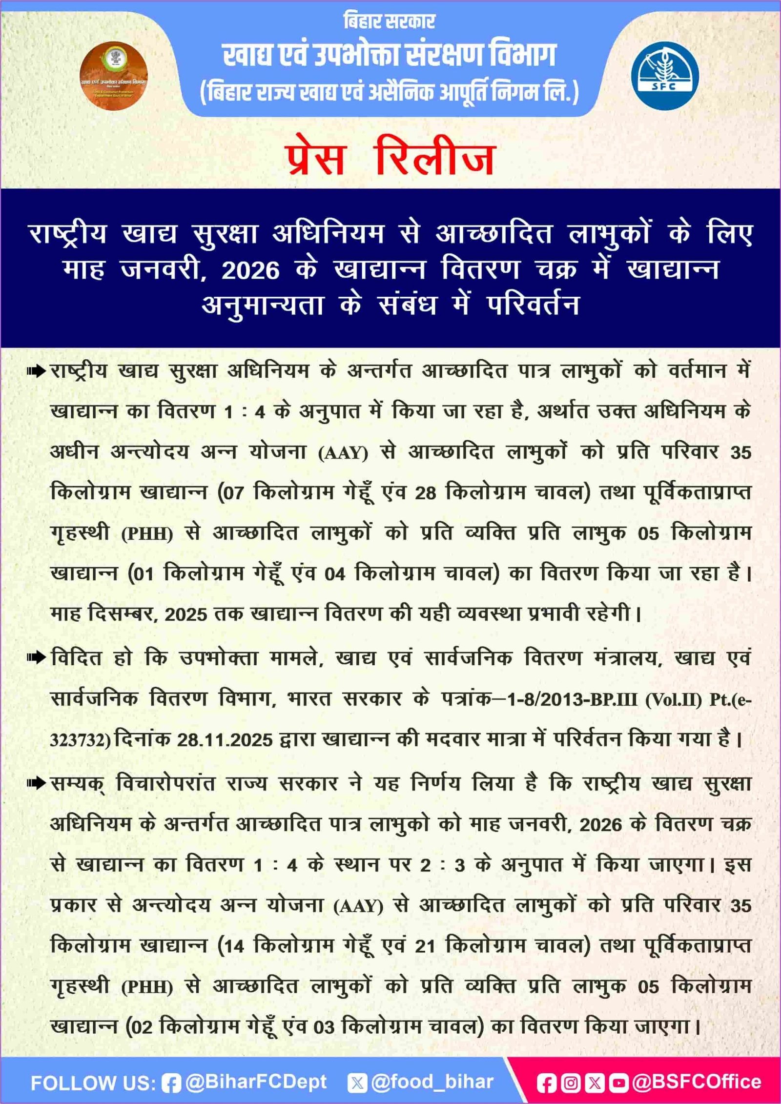 राज्य सरकार ने अपने प्रेस नोट में स्पष्ट किया है कि जनवरी 2026 से NFSA लाभुकों को मिलने वाले खाद्यान्न का अनुपात 1:4 से बदलकर 2:3 कर दिया जाएगा।
